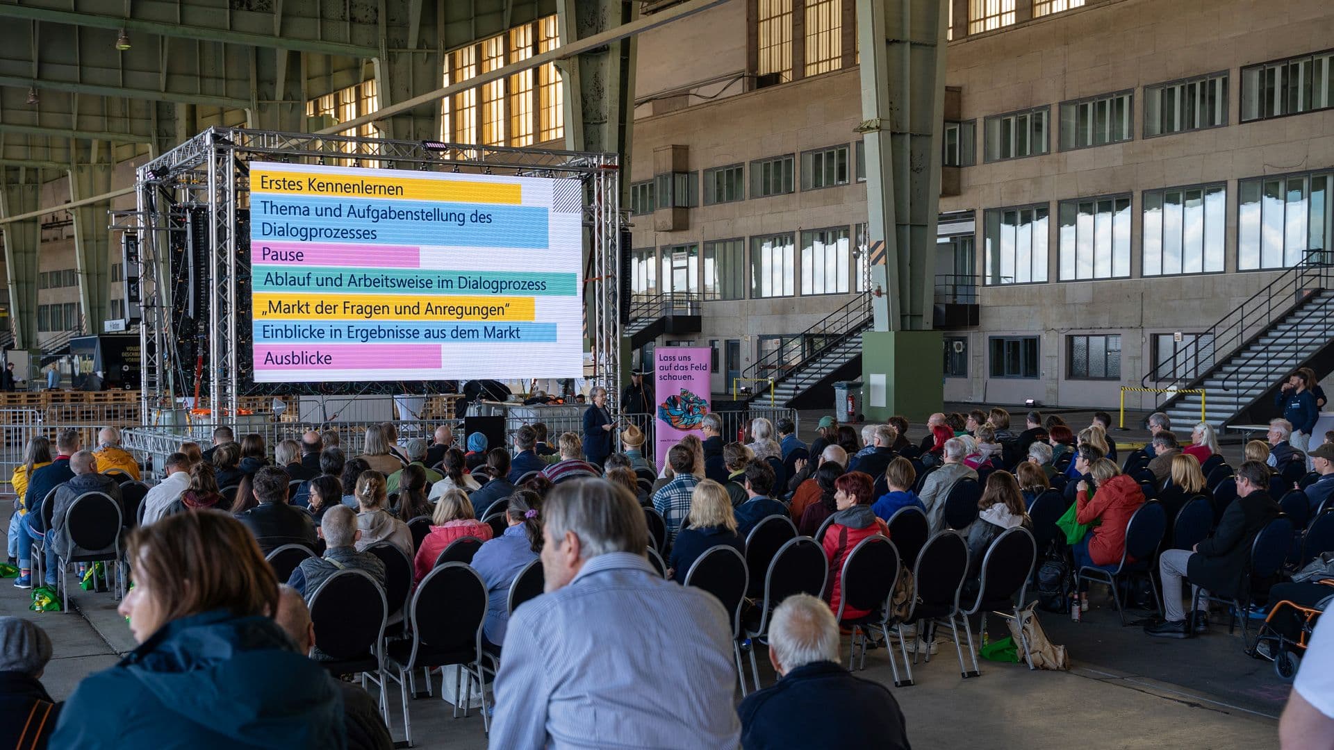 „Dieser Dialog ist Ihr Beitrag zu einer offenen, sachlichen und demokratischen Auseinandersetzung zum Tempelhofer Feld“, begrüßte Michael Künzel von der Senatsverwaltung für Stadtentwicklung, Bauen und Wohnen die Anwesenden auf dem überdachten Vorfeld des Flughafens Tempelhof. Mit dem Bebauungsverbot durch den Volksentscheid von 2014 sei der Stadt eine Denkpause auferlegt worden. „Und diese Denkpause wollen wir nutzen, um nachzudenken, was wäre denn, wenn das Feld anders entwickelt wird, als es heute ist.“ Fabian Schmitz-Grethlein von der Tempelhof Projekt GmbH spielte auf die wechselvolle Geschichte und Nutzung des Geländes an: „Der Flughafen ist schon immer ständig im Werden, nie im Sein.“