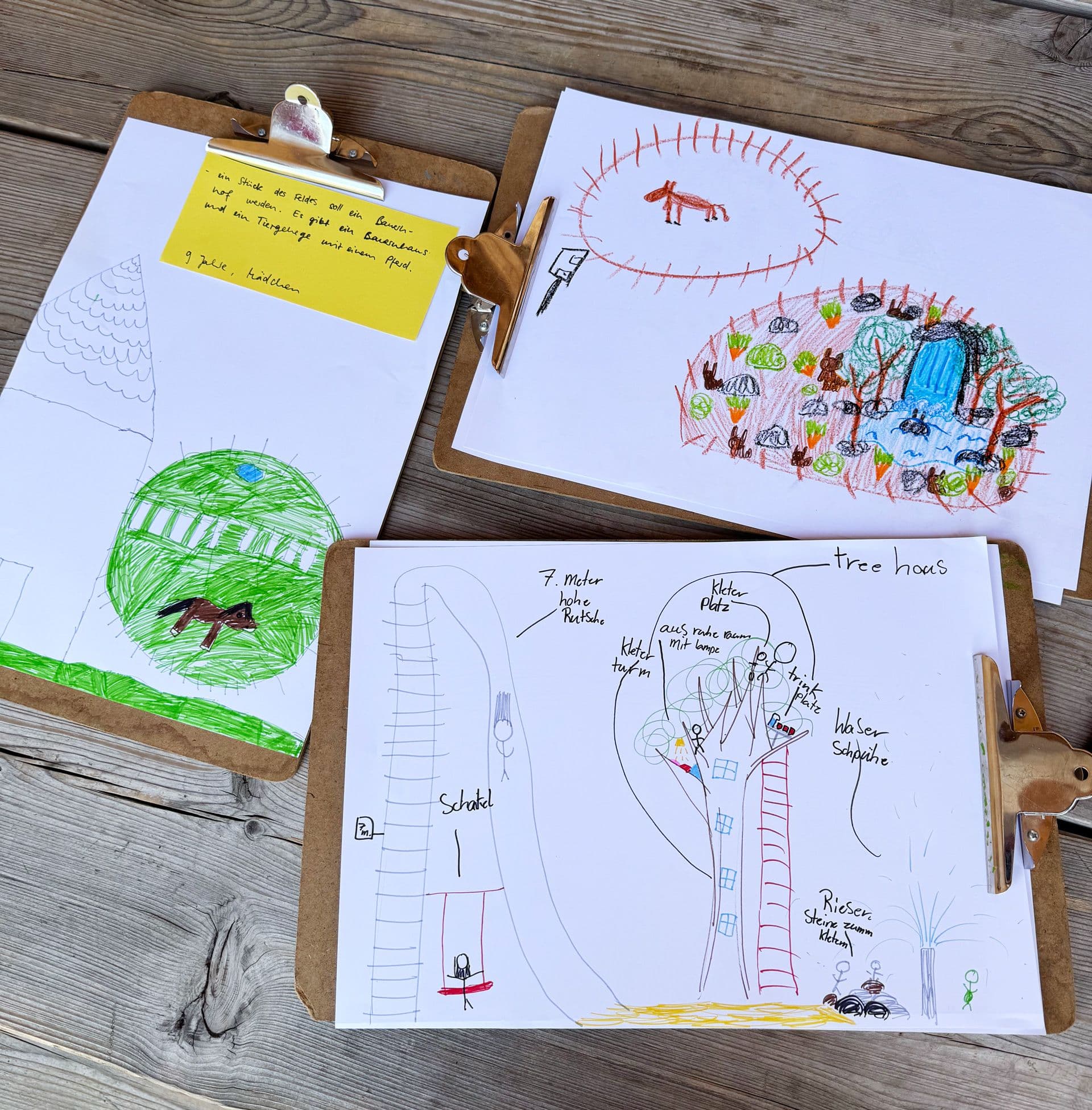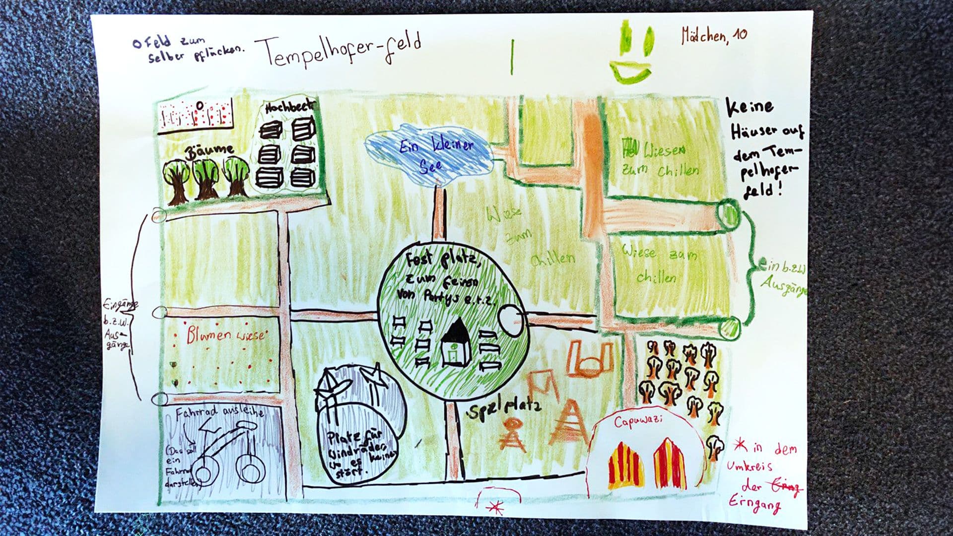 Konzentriert beugt sich ein neunjähriges Mädchen über das Blatt Papier auf dem Boden vor ihr. Mit energischen Strichen malt sie ein Baumhaus neben der „sieben Meter hohen“ Rutsche. In der Lego-Gruppe nebenan stellt ein Junge gerade seine Vision eines Spiel- und Abenteuerplatzes vor. Auch Skaterbahnen, Blumengärten und Windräder zur Stromgewinnung sind aus den kleinen Bausteinen entstanden. Die kleinen Kunstwerke stehen exemplarisch für die Wünsche und Vorstellungen der Kinder und Jugendlichen für die Zukunft des Tempelhofer Feldes.