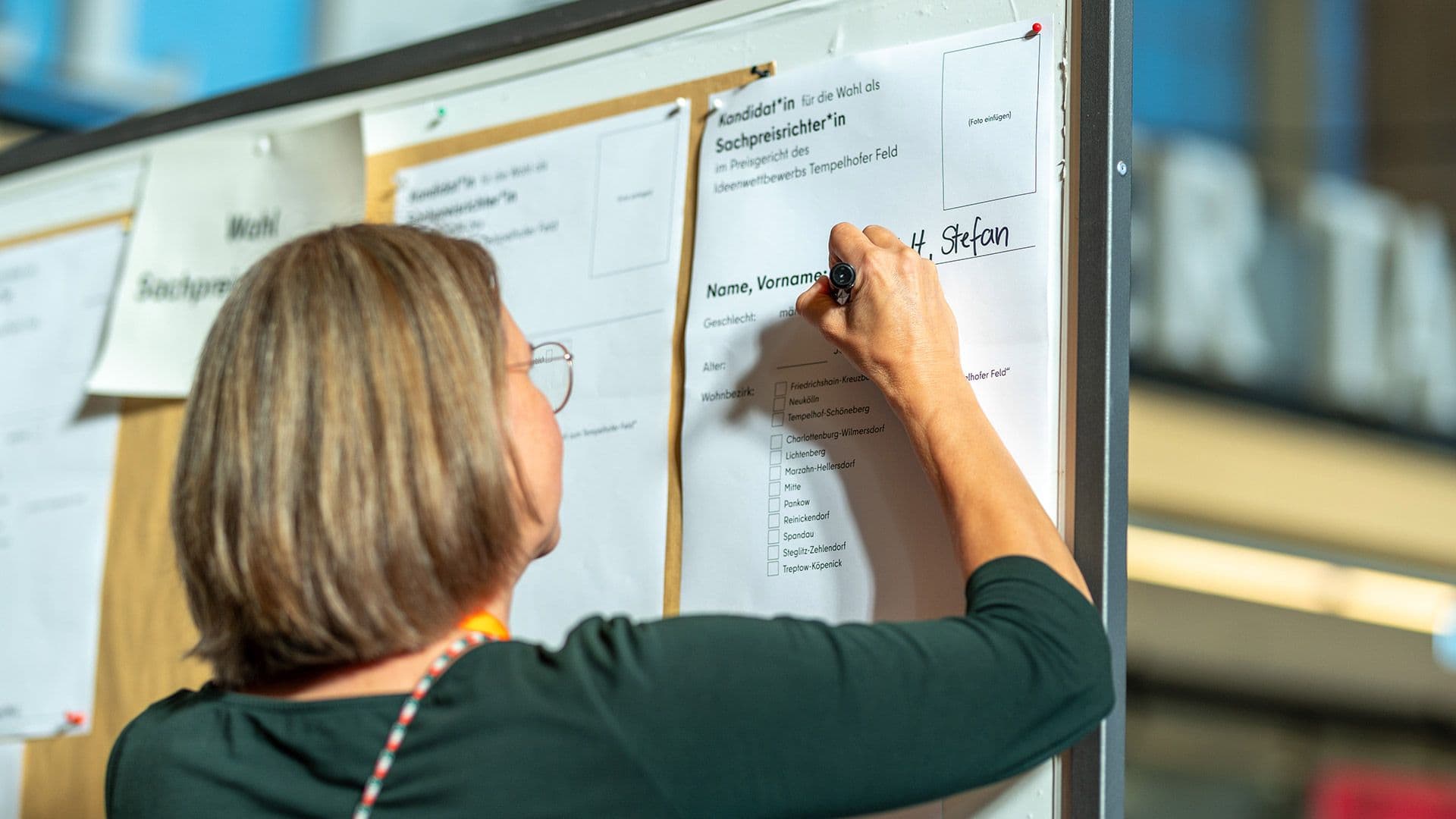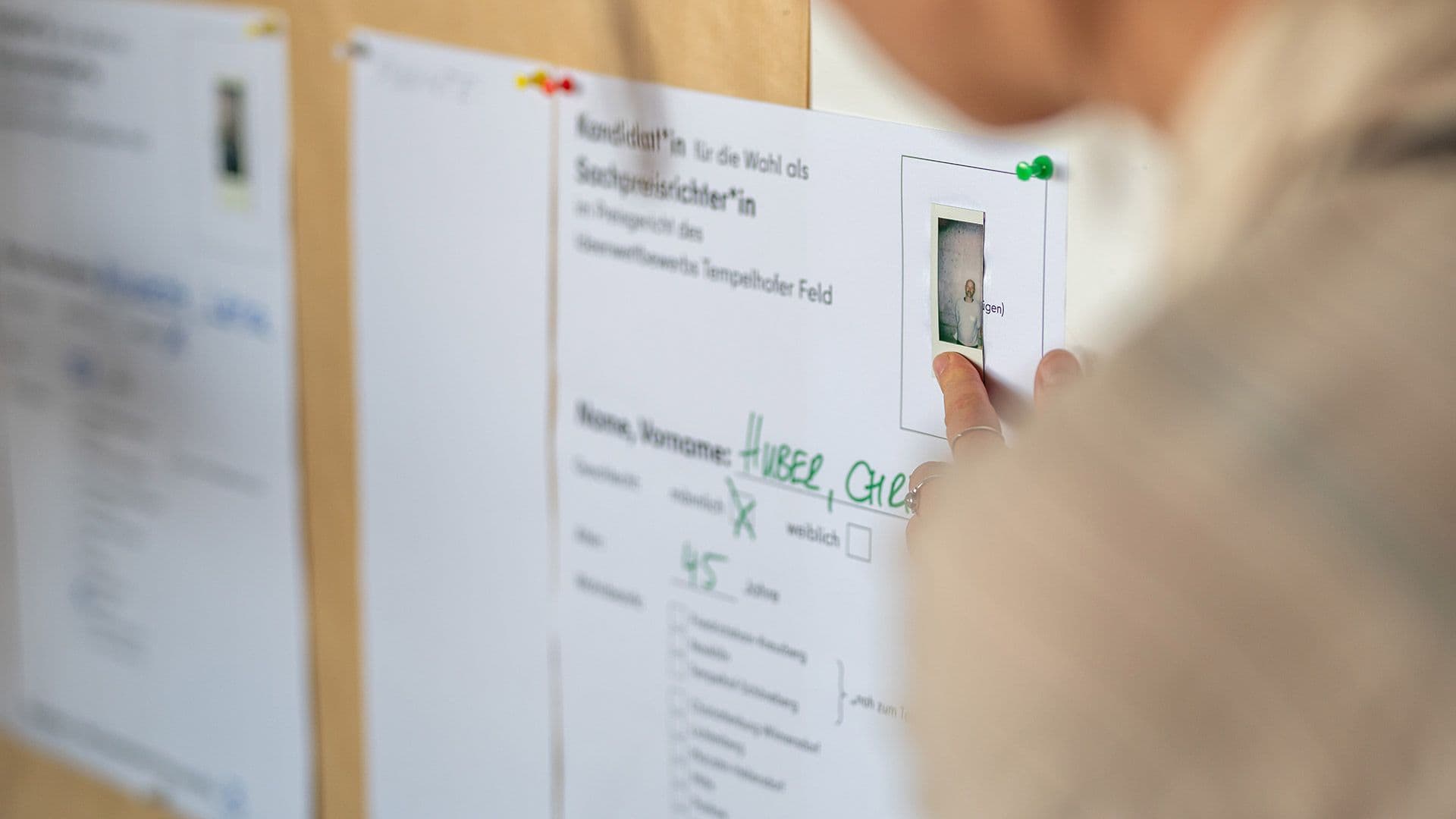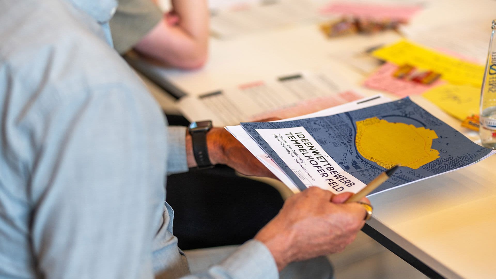 Die Jury bewertet die Entwürfe der Wettbewerbsteilnehmenden, die auf dem Tempelhofer Feld Lösungen für stadträumliche Herausforderungen bieten sollen, und stimmen über sie ab. Diese basieren wiederum auf den Hauptempfehlungen, Entwicklungsperspektiven und räumlichen Aussagen, die die Teilnehmenden während der beiden Dialogwerkstätten erarbeitet haben.